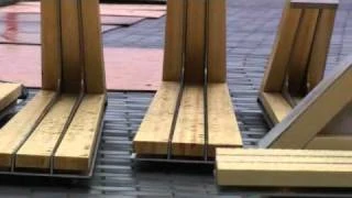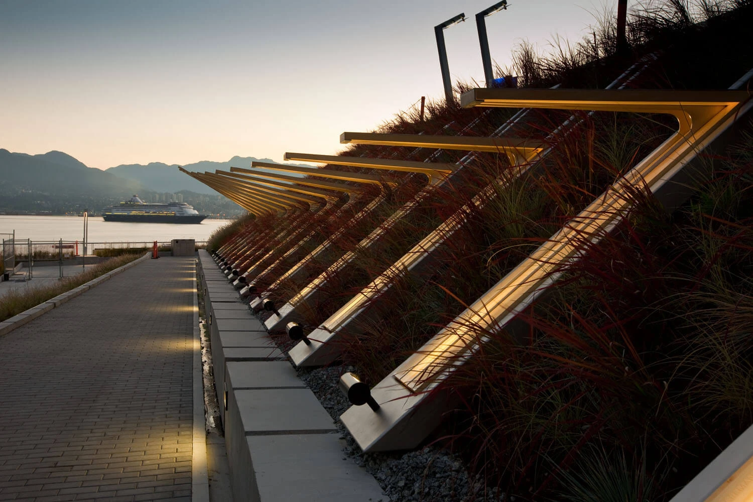 Laminated wood elements peel backwards from the steel elements on the slope, increasing in length and angle to create a growing waveform that reaches out to shelter pedestrians.