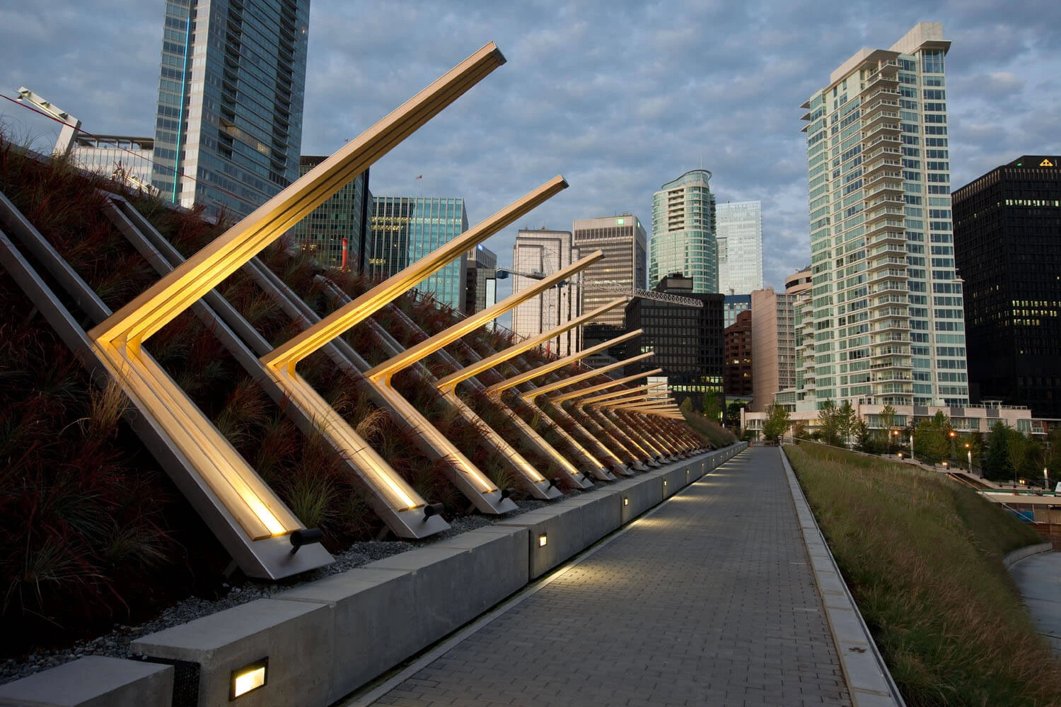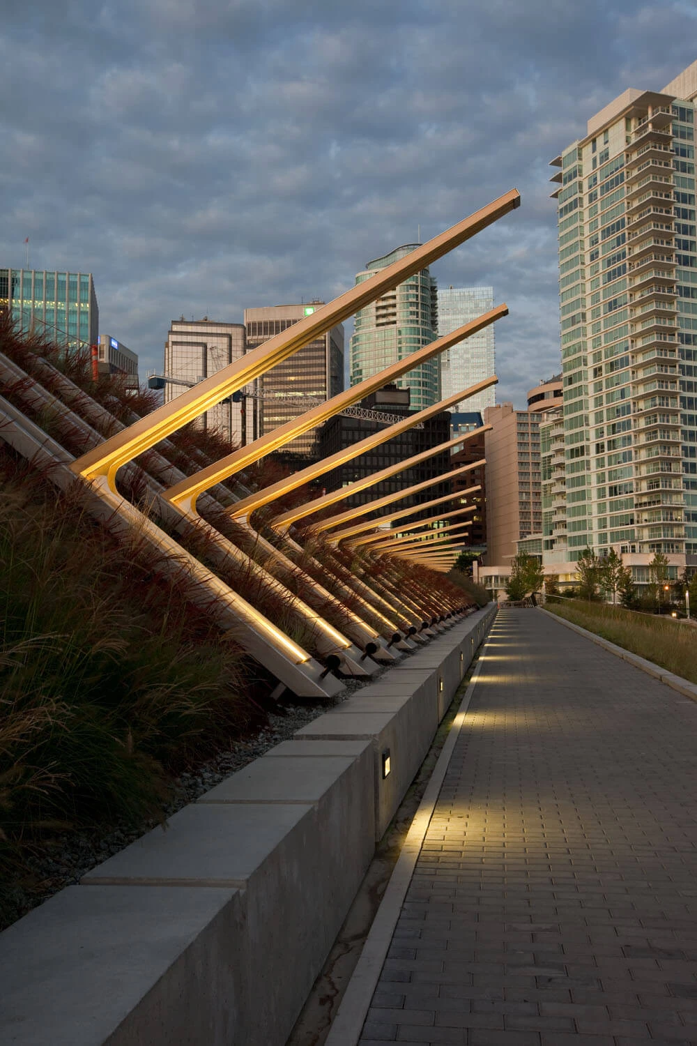 Line of Work is a Worksafe BC public art project that celebrates the evolution and growth of British Columbia's workforce and the increasing role of safety in workers' lives. The sculpture embodies the transition and growth of the province's occupations from those originally centered on physical, natural resources to those increasingly responsive to emerging technologies and innovations. The piece dynamically juxtaposes notions of aspiration, ascension and progress with those of shelter, security and human inhabitation through form, materiality and engagement with the body.